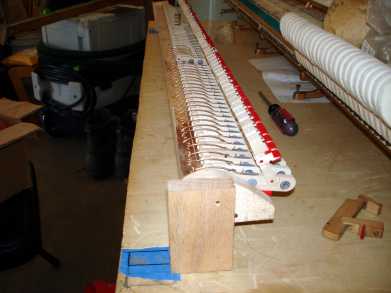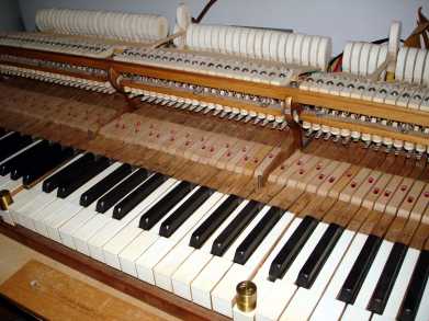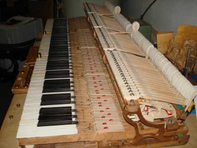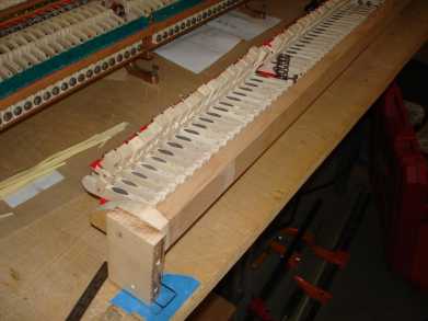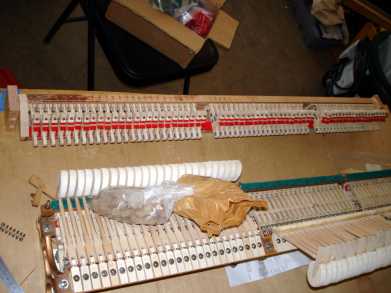 | New damper underlever assembly (aft) and action stack with new action parts and hammers. |