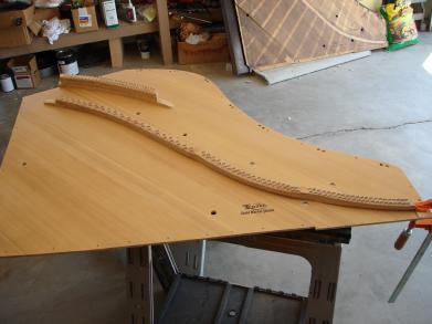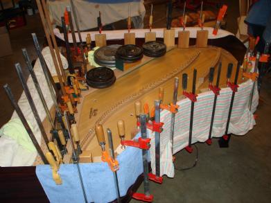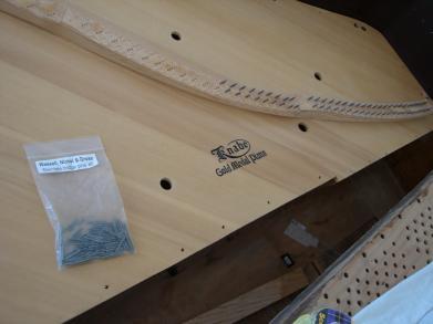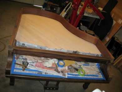 | Soundboard and plate (harp) are now installed and the piano is ready for stringing |